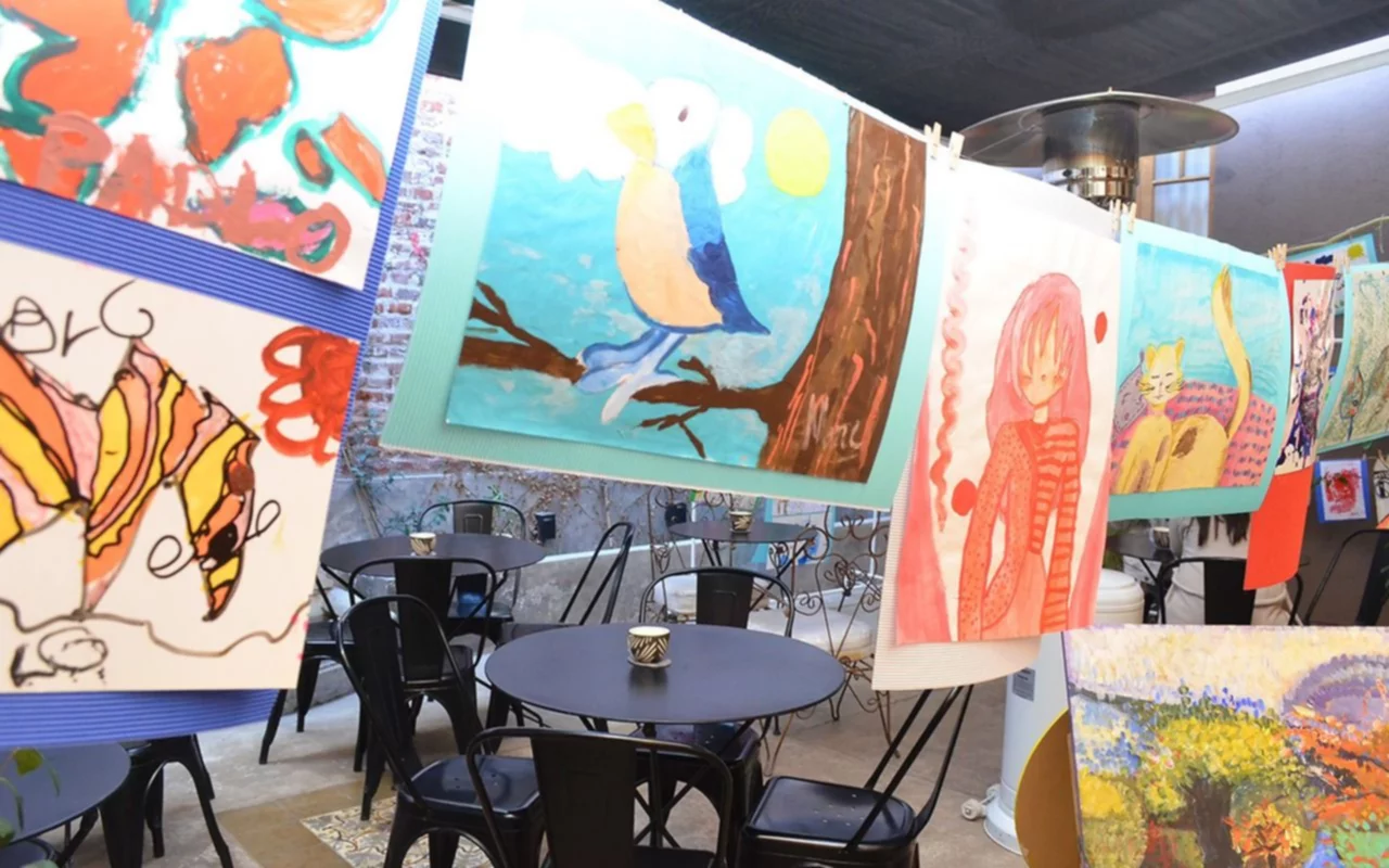 Los estudiantes de la escuela Veneciana de Arte fueron los encargados de decorar con sus obras el patio interno que tiene el bar ubicado en avenida Mitre 1365. El objetivo de la exposición es, además de mostrar los trabajos, recaudar juguetes que serán donados al comedor Lázaro que funciona en calle Brasil 120 extremo sur.