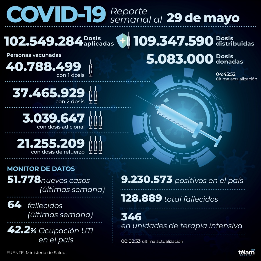 Según el Monitor Público de Vacunación, el total de dosis aplicadas asciende a 102.549.284, de los cuales 40.788.499 recibieron una dosis, 37.465.929 las dos, 3.039.647 una adicional y 21.255.209 una de refuerzo, mientras que las vacunas distribuidas a las jurisdicciones llegan a 109.347.590 y las donadas a 5.083.000.