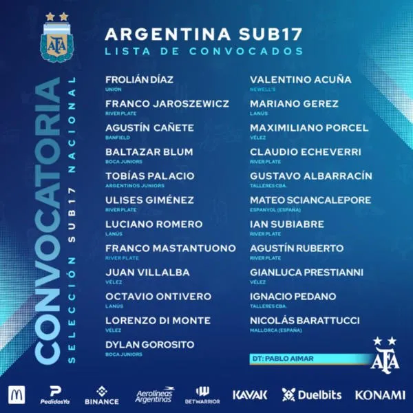 Frolián Díaz, Franco Jaroszewicz, Agustín Cañete, Baltazar Blum, Tobías Palacio, Ulises Giménez, Luciano Romero, Franco Mastantuono, Juan Villalba, Octavio Ontivero, Lorenzo Di Monte, Dylan Gorosito, Valentino Acuña, Mariano Gerez, Maximiliano Porcel, Claudio Echeverri, Gustavo Albarracín, Mateo Sciancalepore, Ian Subiabre, Agustín Ruberto, Gianluca Prestianni, Ignacio Pedano y Nicolás Barattucci.